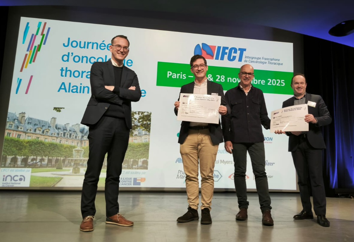Remise des deux Prix Alain Depierre aux Dr Matthieu Roulleaux Dugage (Gustave Roussy) & Dr Marion Tonneau (Absente sur la photo, à Boston) par Alexis Cortot (Président de l'IFCT), Jaafar Bennouna (Secrétaire du CS) et Franck Morin (Directeur de l'IFCT).